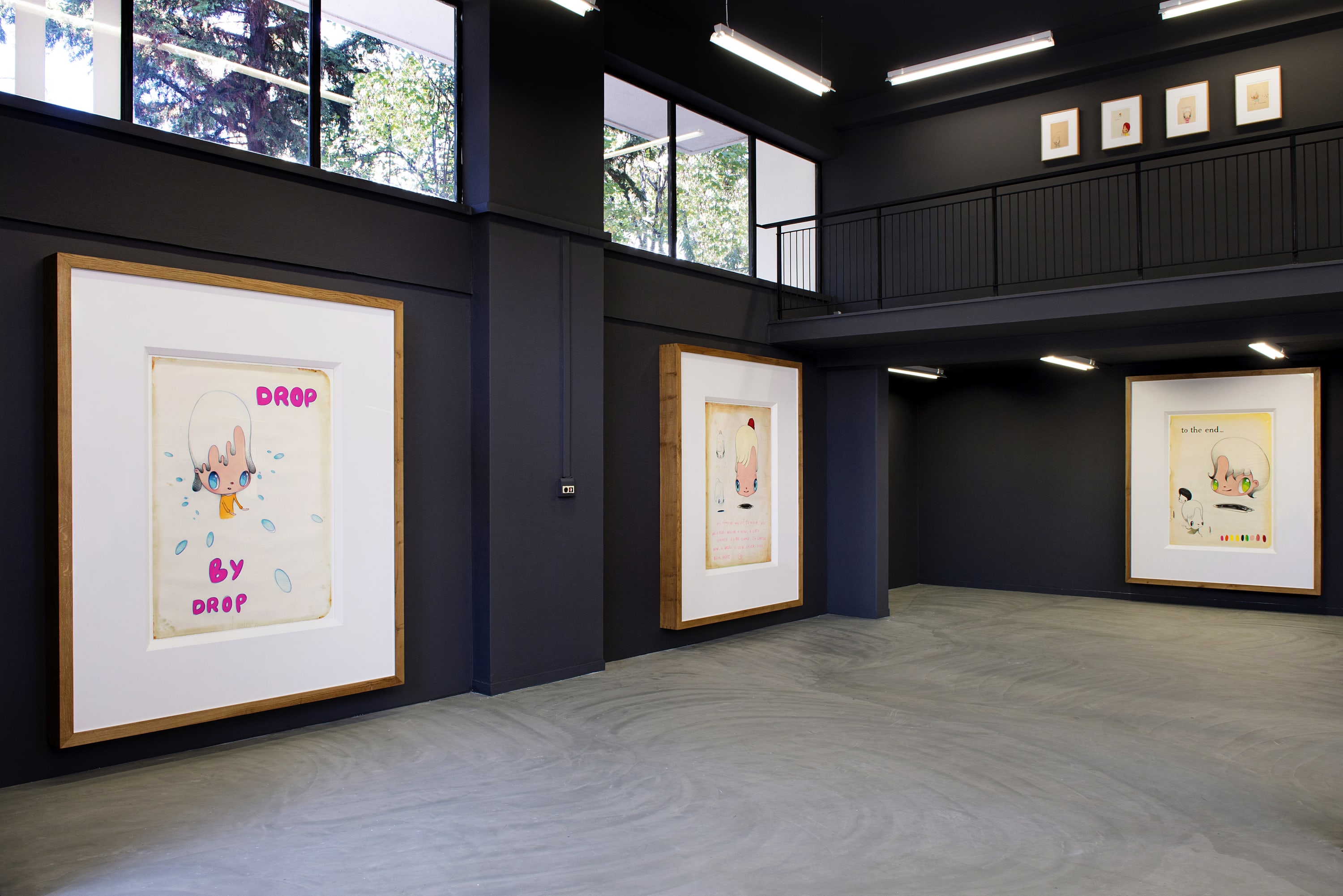 Tirelessly moving through the art world “step by step” and consistently making connections between his humble beginnings and the recent successes, Calleja's newest presentation includes a couple of poetic bridges between the past and the present. Showing exclusively works on paper, namely 10 drawings, the exhibition once again utilizes his love for this most sincere of mediums as well as for the play with scale. By contrasting 5 small-scale drawings against 5 otherworldly, blown-up, big-scale ones, Malagan artist once again puts the viewer as the center point of the installation. Experiencing the works in a black space of the gallery, the observer becomes a steady reference point surrounded with works of shifting scales. Simultaneously, the artist reintroduces the use of typography in his work, evoking the book aesthetics and suggesting the existence of a bigger story around the individual, imaginary page.
